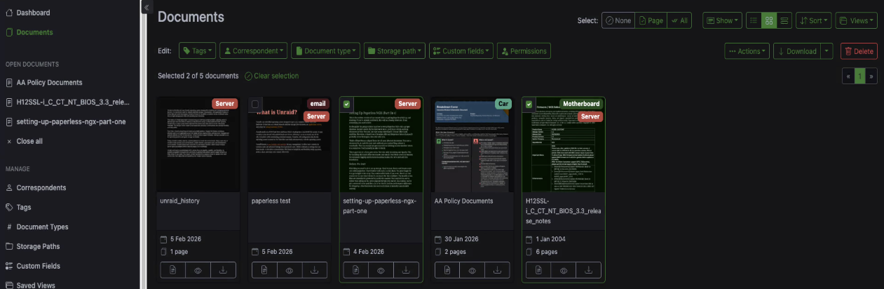 Paperless AI is the one doing the heavy lifting. It reads the text in your documents and handles tagging, document types, correspondents, and titles. It's also got a RAG chat feature so you can ask questions across your entire collection.