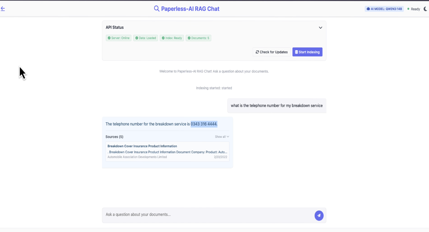 There's also the RAG chat. This builds an index across all of your documents so you can ask questions that span everything. Click start indexing and let it finish. Once it's ready, you can ask things like "what's the telephone number for my breakdown service?" and it'll track down the answer from whichever document it's in. Really handy when you've got hundreds of documents and can't remember which one has the detail you're after.